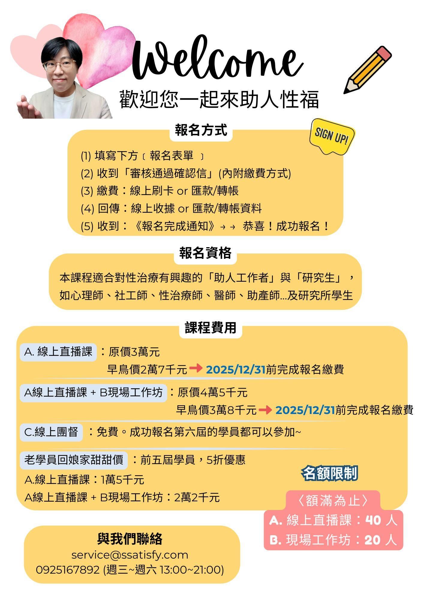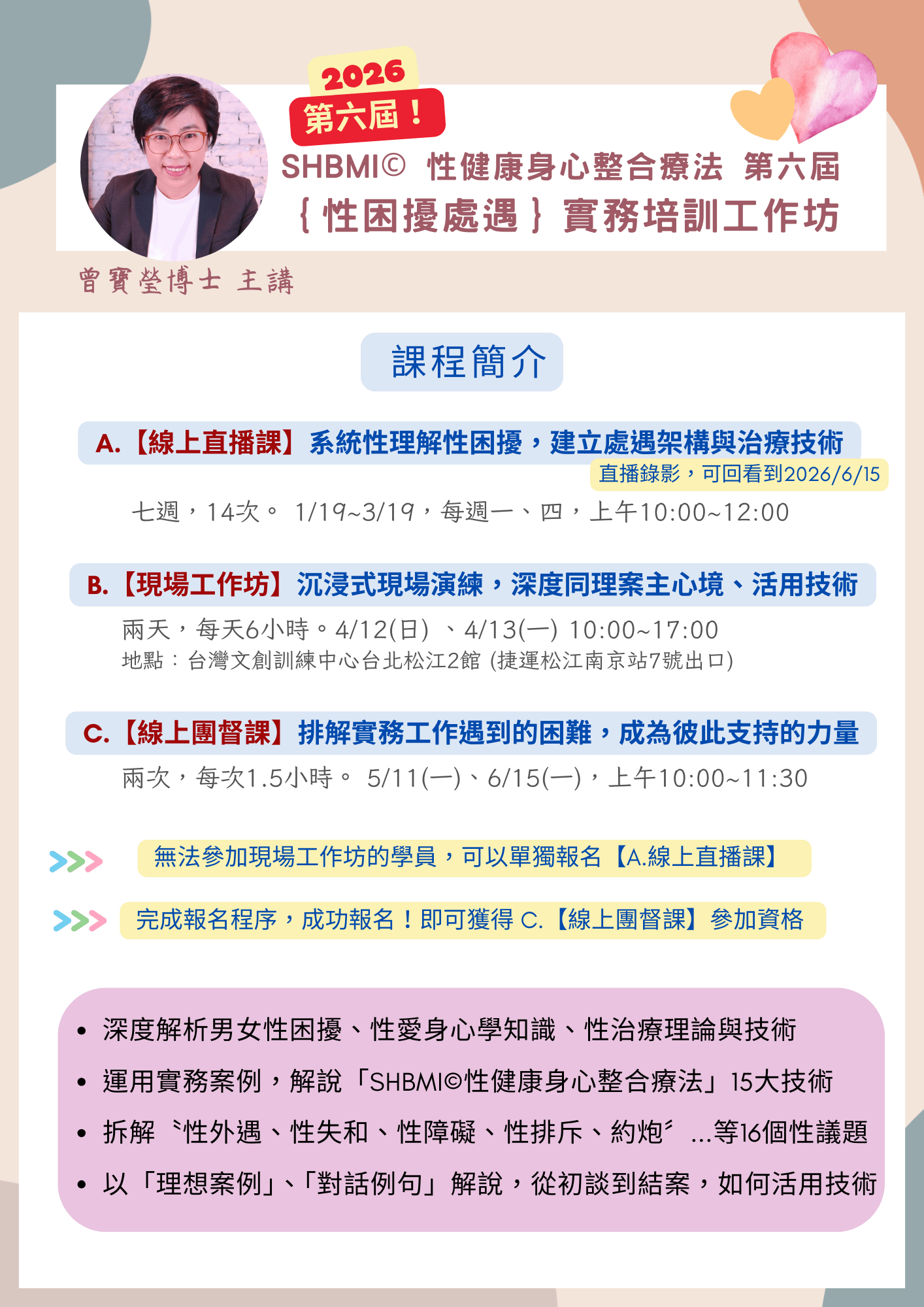 【A.線上直播課+B.現場工作坊 (老學員回訓,5折優惠價) 】2026第六屆 【SHBMI©性健康身心整合療法】{性困擾處遇}實務培訓工作坊
