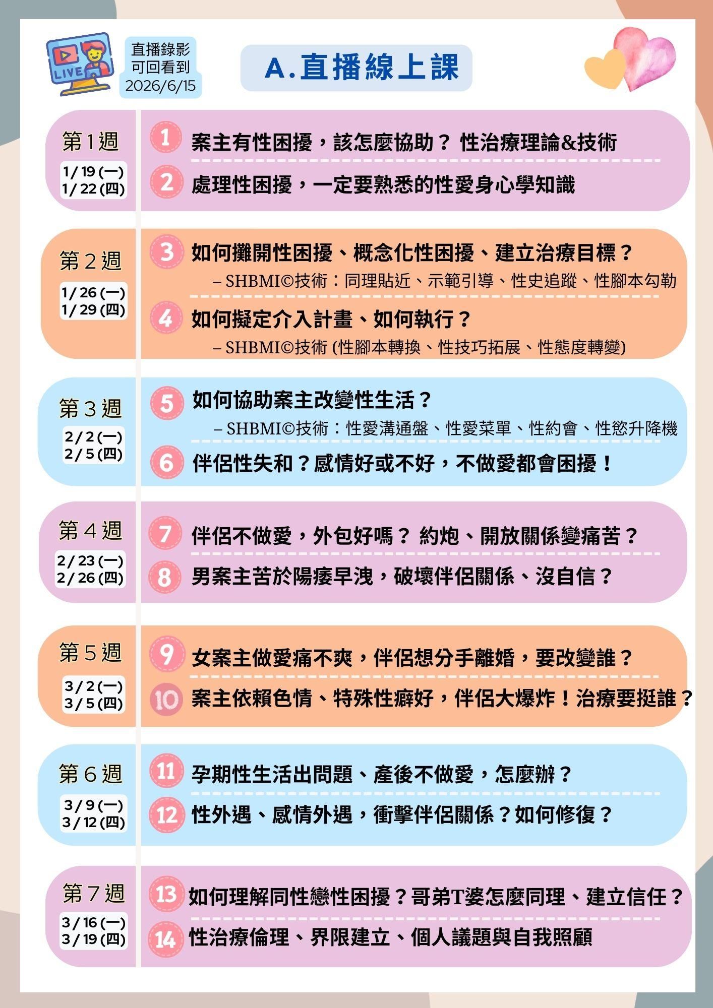 - 線上直播課登入網址,將於2026/1/16(五)統一寄發。