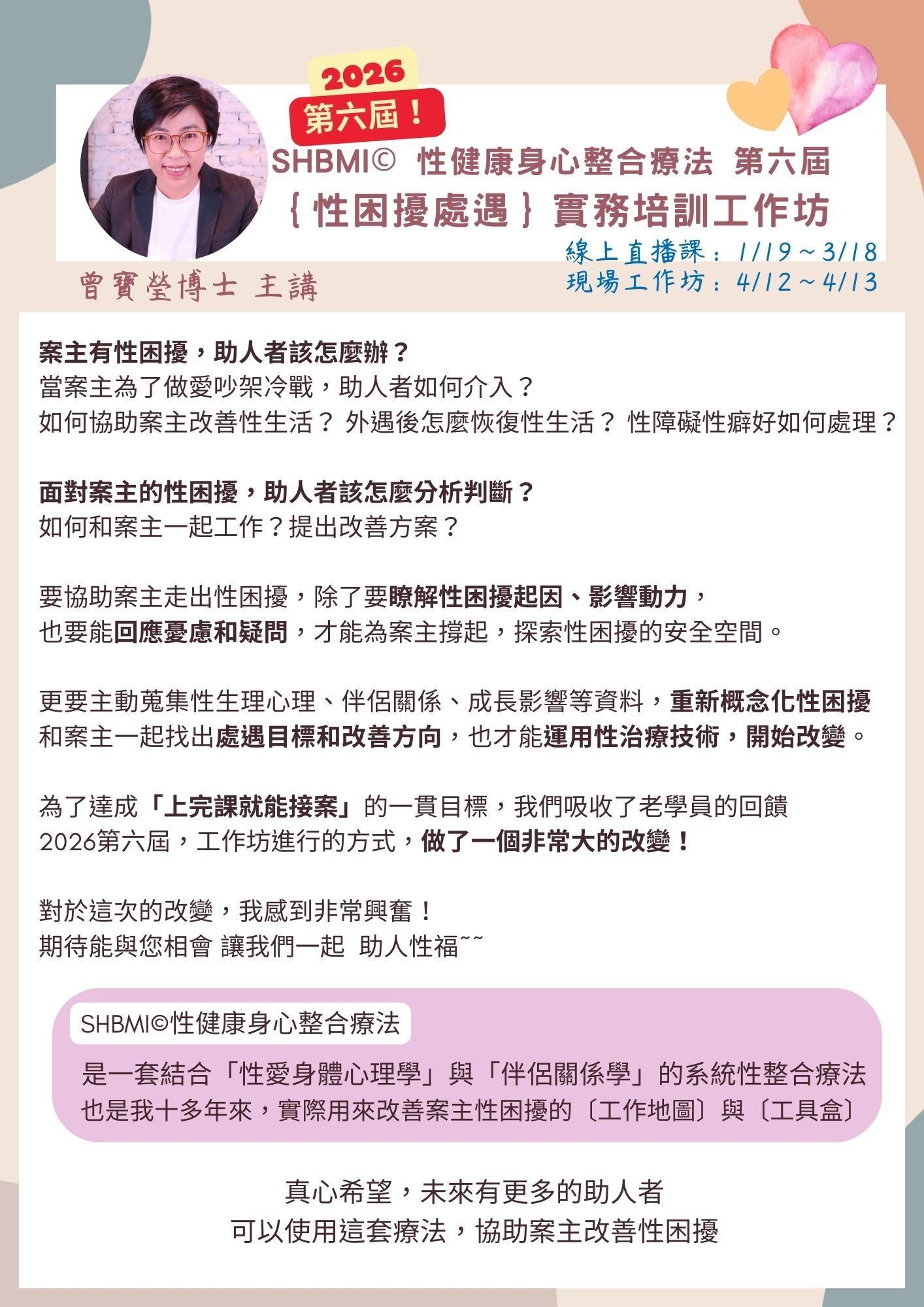 曾寶瑩博士【A.線上直播課+B.現場工作坊 (老學員回訓,5折優惠價) 】2026第六屆 【SHBMI©性健康身心整合療法】{性困擾處遇}實務培訓工作坊